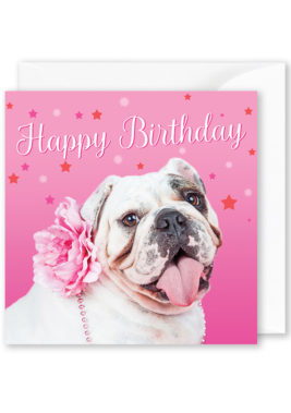 Square card: “Happy Birthday” Bulldog with Flower