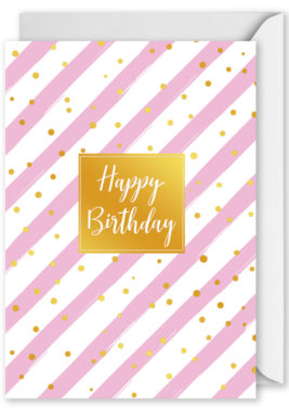 Foiled Vertical Birthday Card: “Happy Birthday” Gold dots on Diagonal Pink Stripes