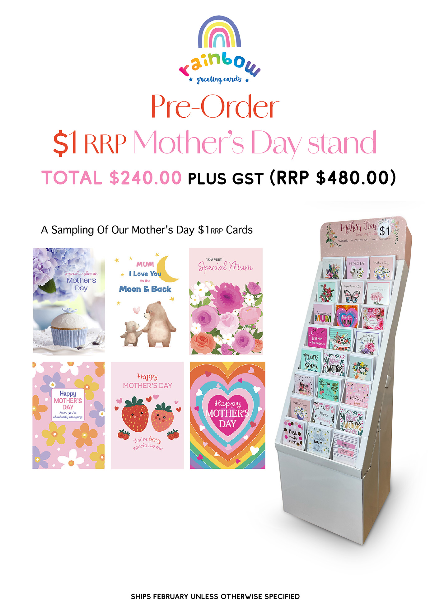 Pre-order our Mother’s Day Display. This display holds 24 packs of cards (20 cards per pack), for a total of 480 cards. The wholesale cost per card is $0.50 + GST. The total stand cost is $240 + GST.