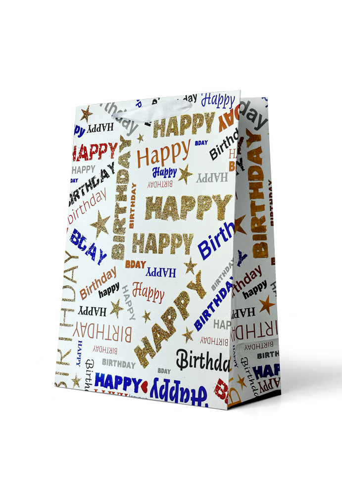 Gift Bag Large: “Happy Birthday” Gold Glitter on White