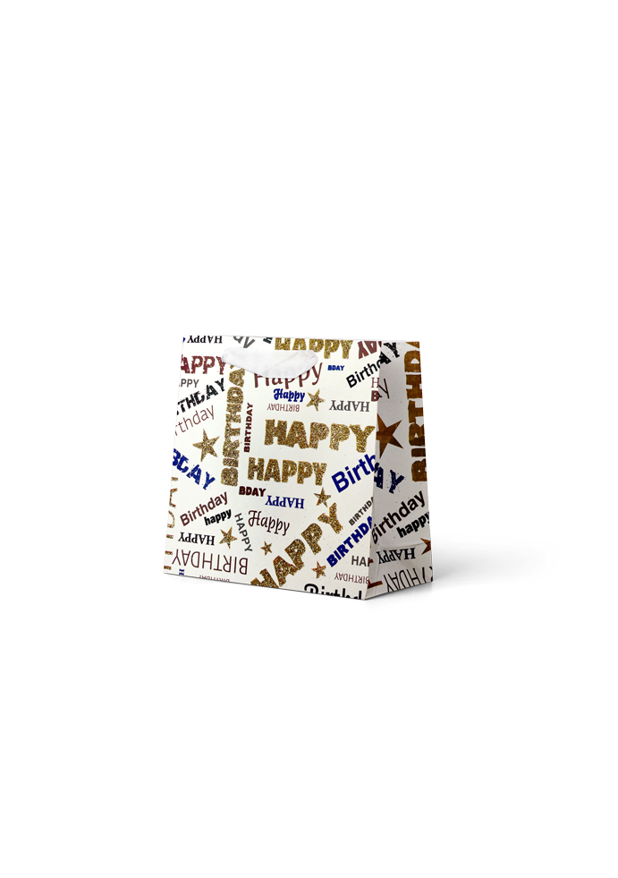 Gift Bag Small: “Happy Birthday” Gold Glitter on White
