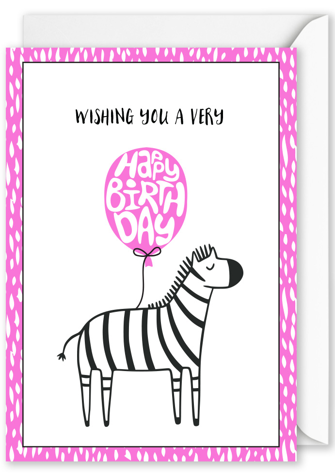 Birthday Card: “wishing you a happy birthday” zebra with balloon neon