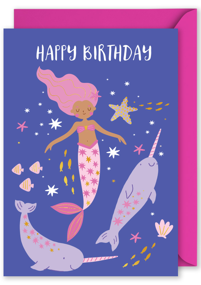 Foiled Blank Vertical Card: Mermaid and Dolphins on Purple