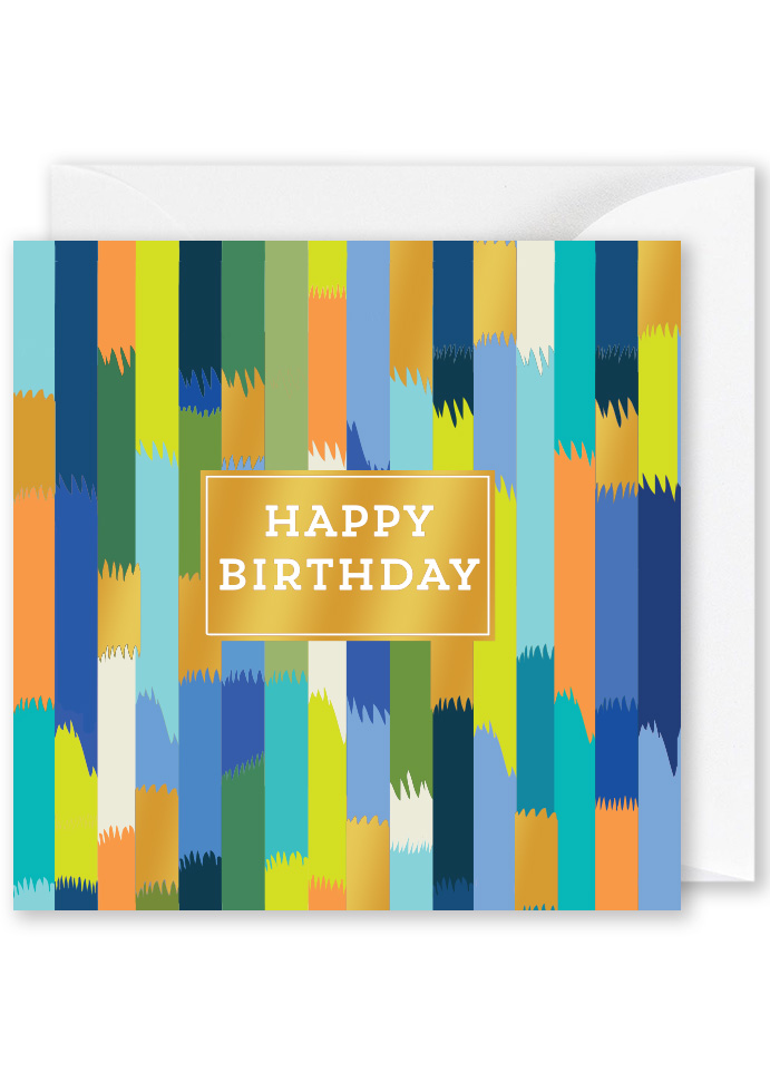 Foiled Square Card: “Happy Birthday” Multi colour Vertical Stripes