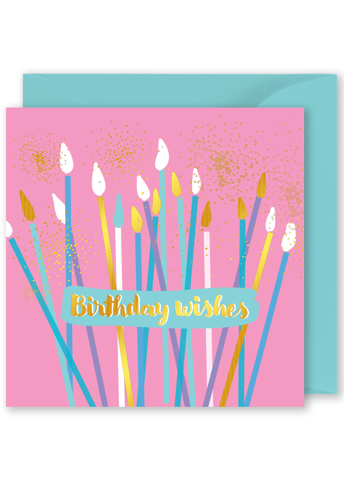 Oak Press Foiled Square Card: Colourful Candles with Gold Sparkles