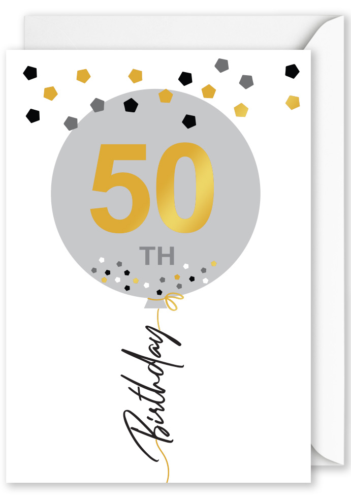 Paintbox Card: 50TH Silver Balloom with Gold & Silver Confetti